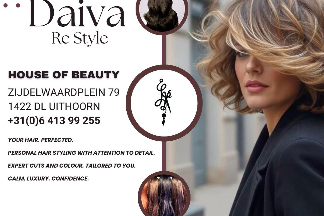 Daiva Re Style Uithoorn is een kapsalon waar zorg, comfort en vakmanschap centraal staan, met als doel iedere klant te laten genieten van een perfect kapsel dat past bij hun persoonlijkheid en levensstijl. De salon combineert professionele expertise met een warme en toegankelijke benadering, waardoor elke behandeling een fijne ervaring wordt.